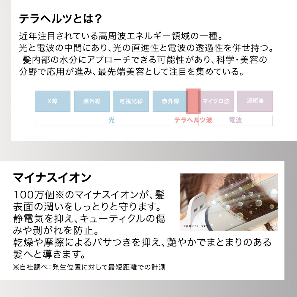 テラヘルツ波が髪内部の水分バランスに働きかけ、キューティクルを補修・保護して本来の保水力をサポート。さらにセラミックコーティングが熱を均一に伝え、なめらかな使い心地で自然なツヤ髪へ導きます。加えて100万個※のマイナスイオンが潤いを守り、静電気やキューティクルのダメージを防止。乾燥や摩擦によるパサつきを抑え、しっとりまとまりのある美しい仕上がりを実現します。