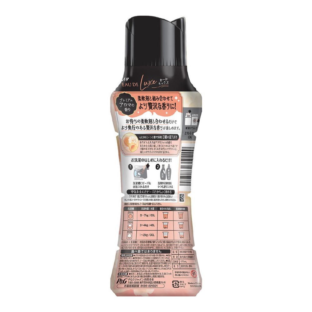 お持ちの柔軟剤と合わせるだけでより奥行のある贅沢な香りが楽しめます。心ときめくシーンを香りで再現 日曜の昼下がり ホワイトムスク&アプリコットの香り: 柔らかな太陽と優しく輝く木々のもとで過ごす日曜の昼下がり。甘くみずみずしいアプリコットと、優しいホワイトムスクの香りに包まれる。縦型・ドラム式どちらでもOKお洗濯のはじめに入れるだけ!*当社ビーズ製品内 香り付け専用ビーズ
