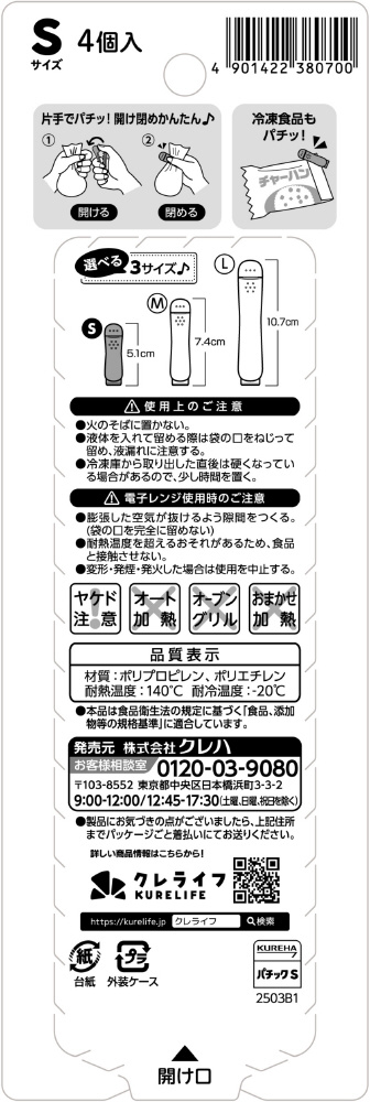 片手で簡単!パチッとワンタッチ!便利な袋用クリップ。Sサイズ4個入り