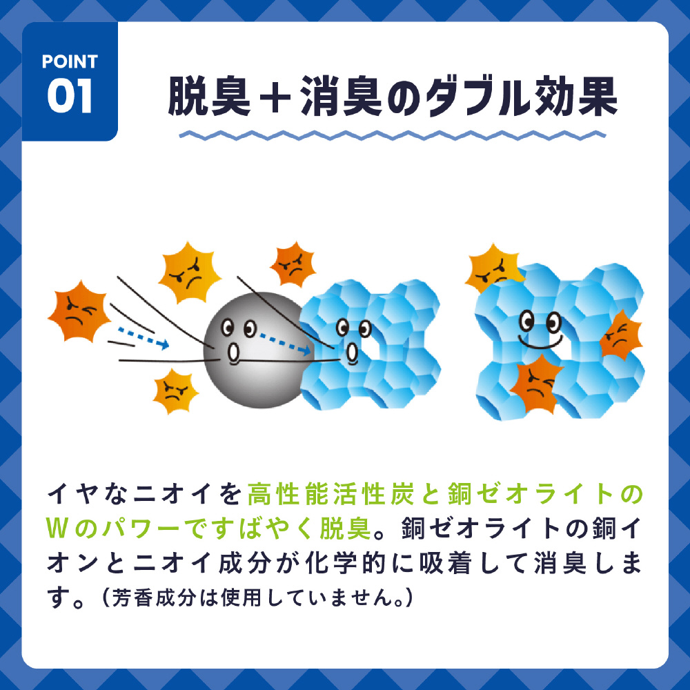 ●生ゴミや靴箱のイヤなニオイを活性炭と銅ゼオライトがすばやく脱臭し、化学的に吸着して消臭します。