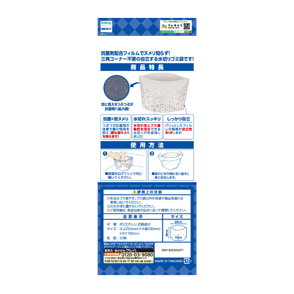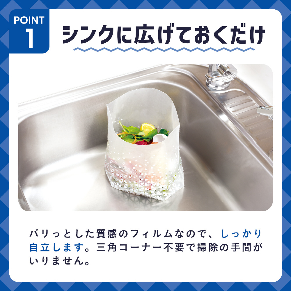 ●抗菌剤配合フィルムでヌメリ知らずの自立型水切りゴミ袋です。