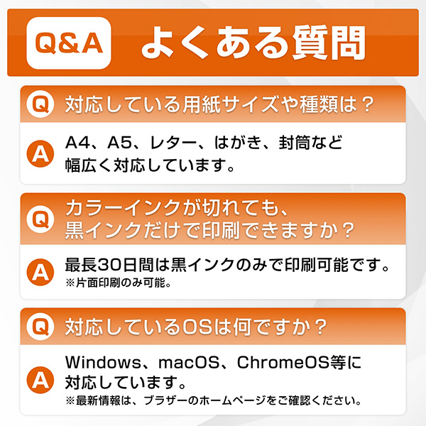 カラーインクが切れても、最長30日間は、黒インクのみを使用したモノクロ印刷が可能です。