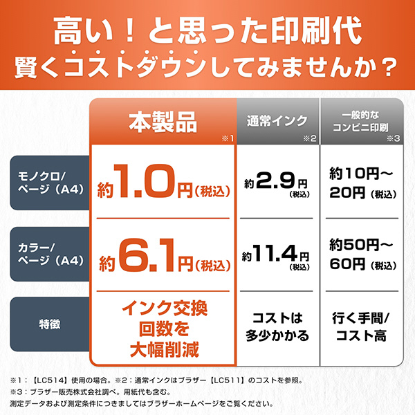 一回のインク交換でモノクロ/カラー共に約1,200ページの印刷が可能です。