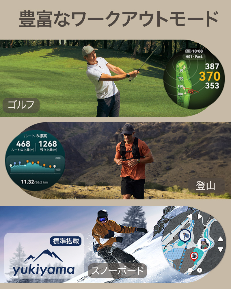 ゴルフ、フリーダイビング、トレイルランニング、ランニングフォーム分析、情緒モニタリング、心電図分析など様々な機能を搭載。