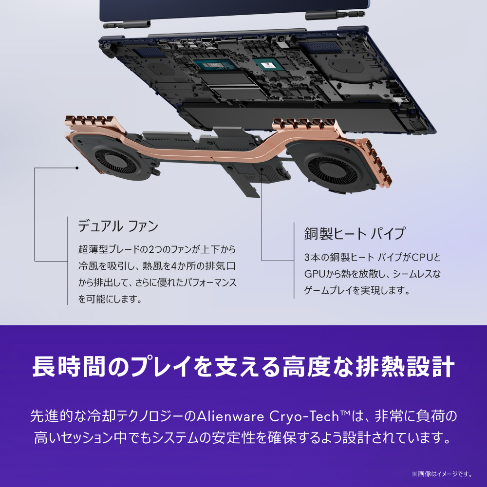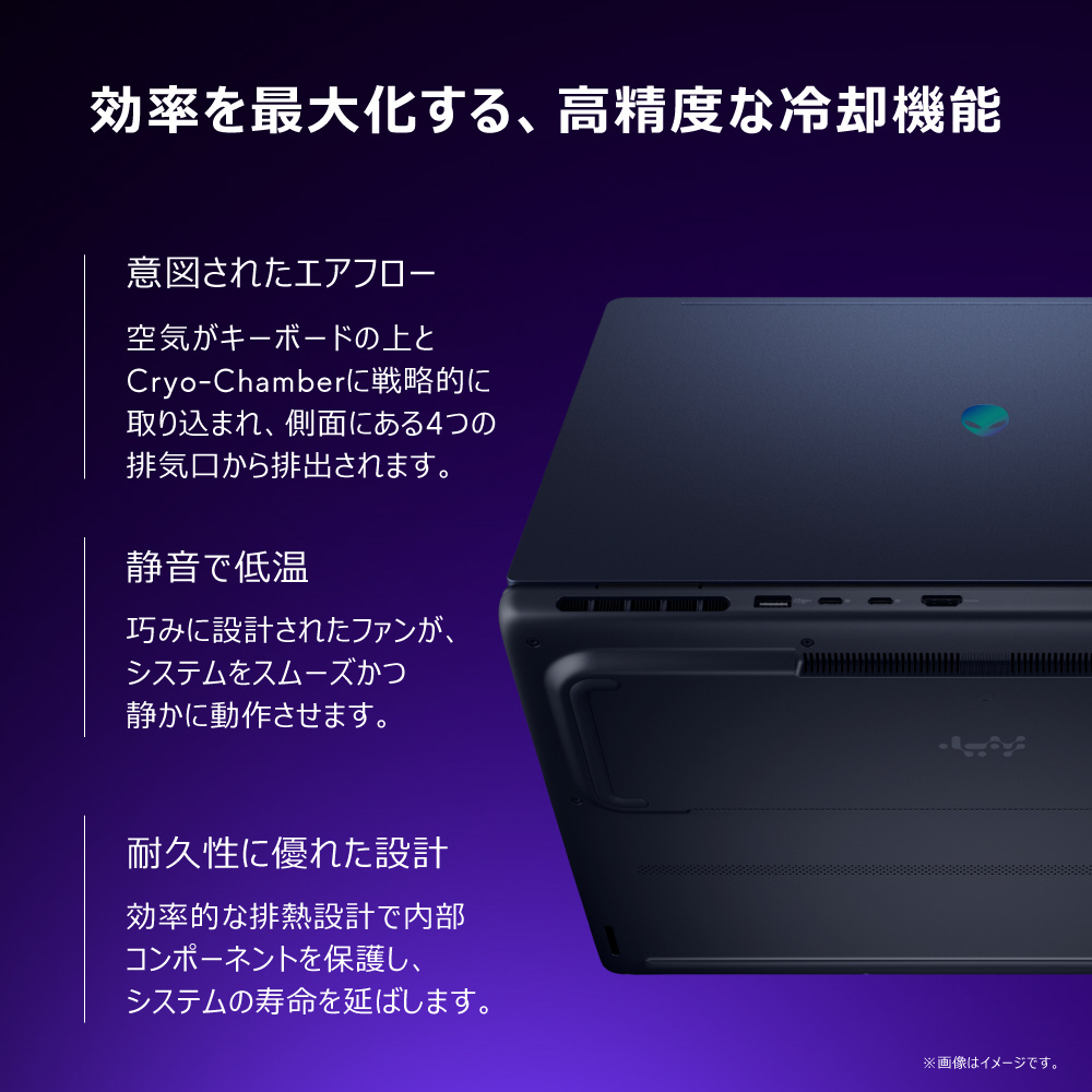 Alienware 16 Auroraは、背面のサーマル シェルフを使用せずに高度な排熱処理をサポートするよう効率的に設計されています。