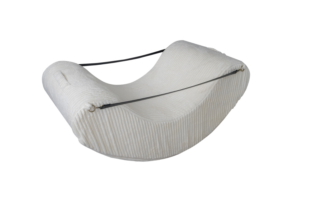 まるでロッキングチェアのような不思議な形をしたウレタンソファと、足を投げ出しても弾力が気持ちいいオットマンのセット