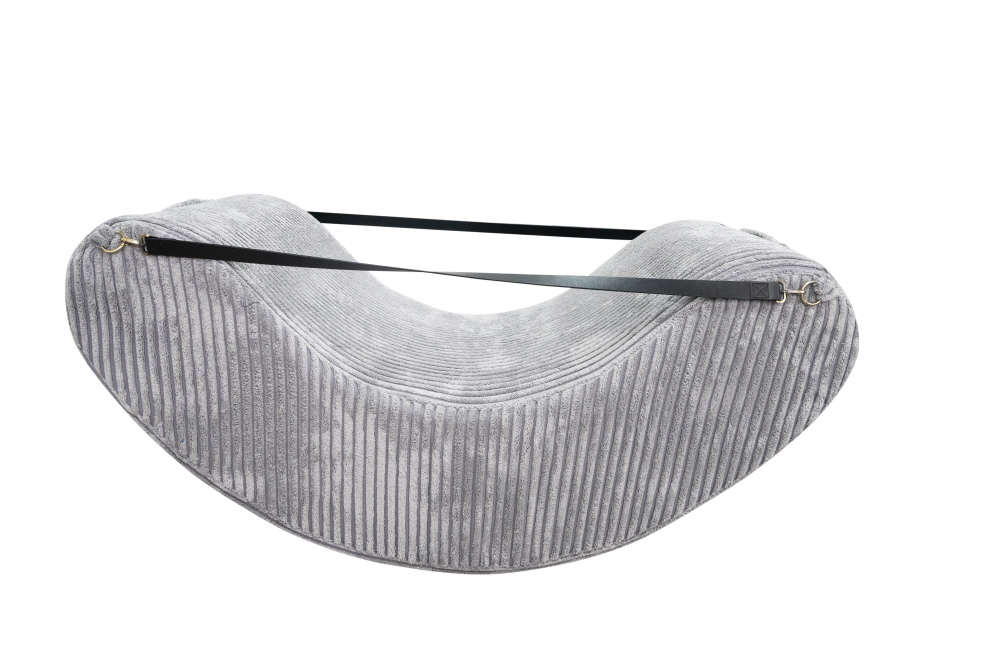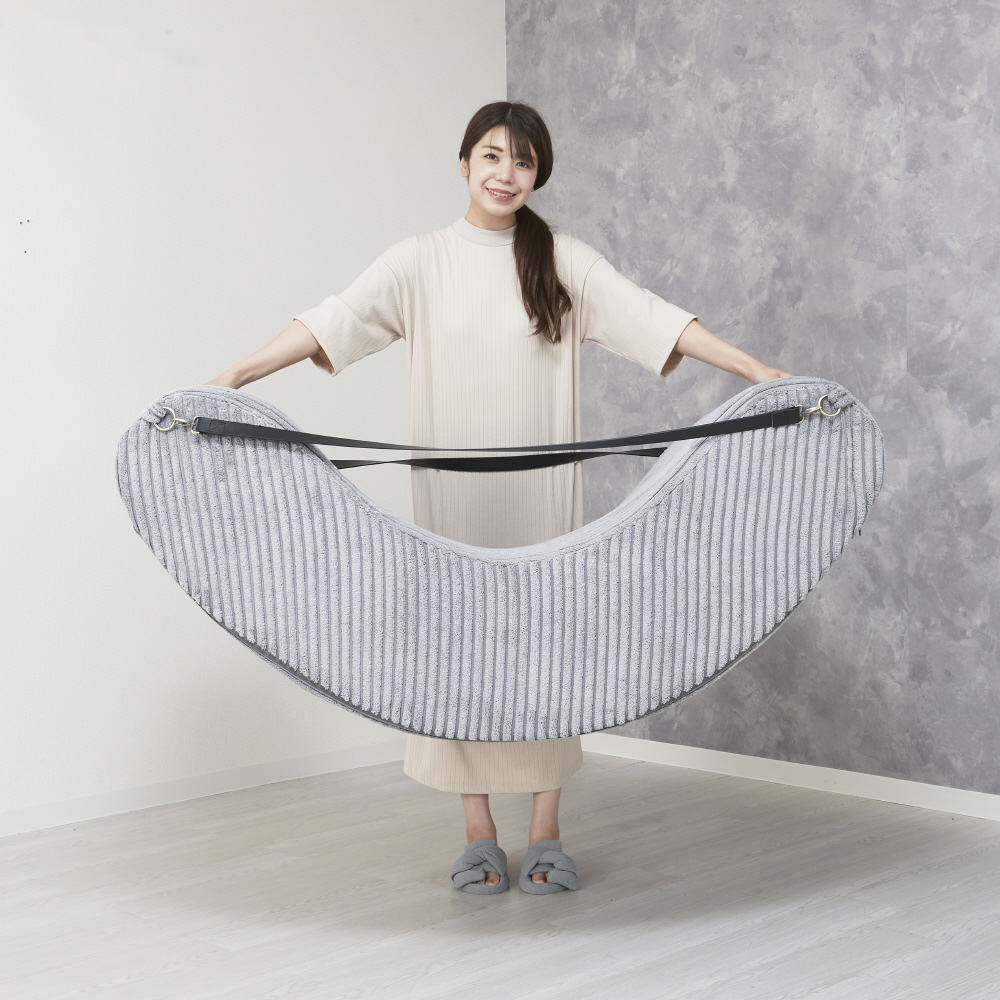 太目コーデュロイ生地が安心の肌触りを、飾りのベルトは好みによって取り外し可能