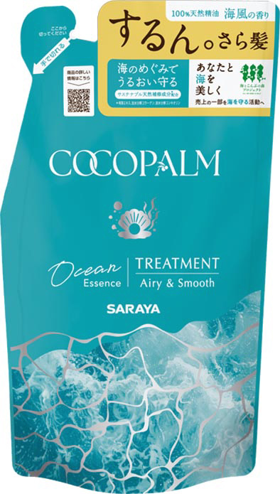 髪と地球にやさしい「ヤシの実生まれ」のアミノ酸系洗浄成分のサステナブルトリートメント。サラヤ独自の天然洗浄成分「ソホロ」配合。落ち着いたまとまりのある、するんさら髪へ。落ち着いた海風の香り。天然精油100%。売上の一部を海を守る活動へ寄付。