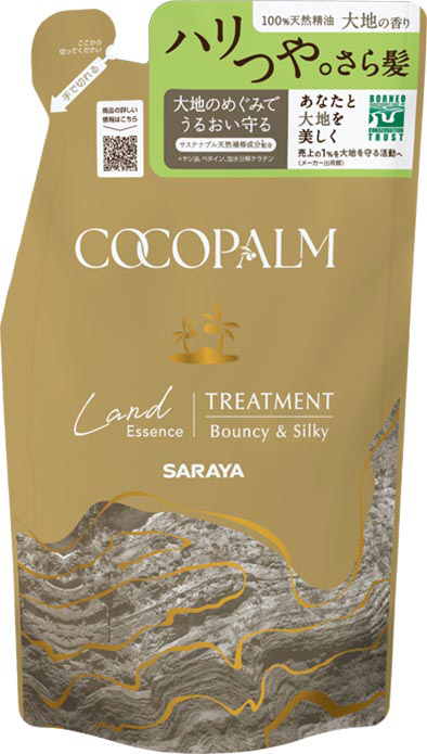 髪と地球にやさしい「ヤシの実生まれ」のアミノ酸系洗浄成分のサステナブルトリートメント。サラヤ独自の天然洗浄成分「ソホロ」配合。根元からふんわりした、ハリつやさら髪へ。豊かな大地の香り。天然精油100%。売上の1%を大地を守る活動へ寄付。
