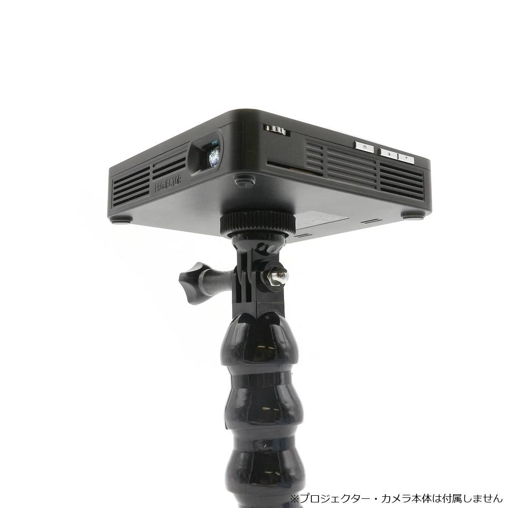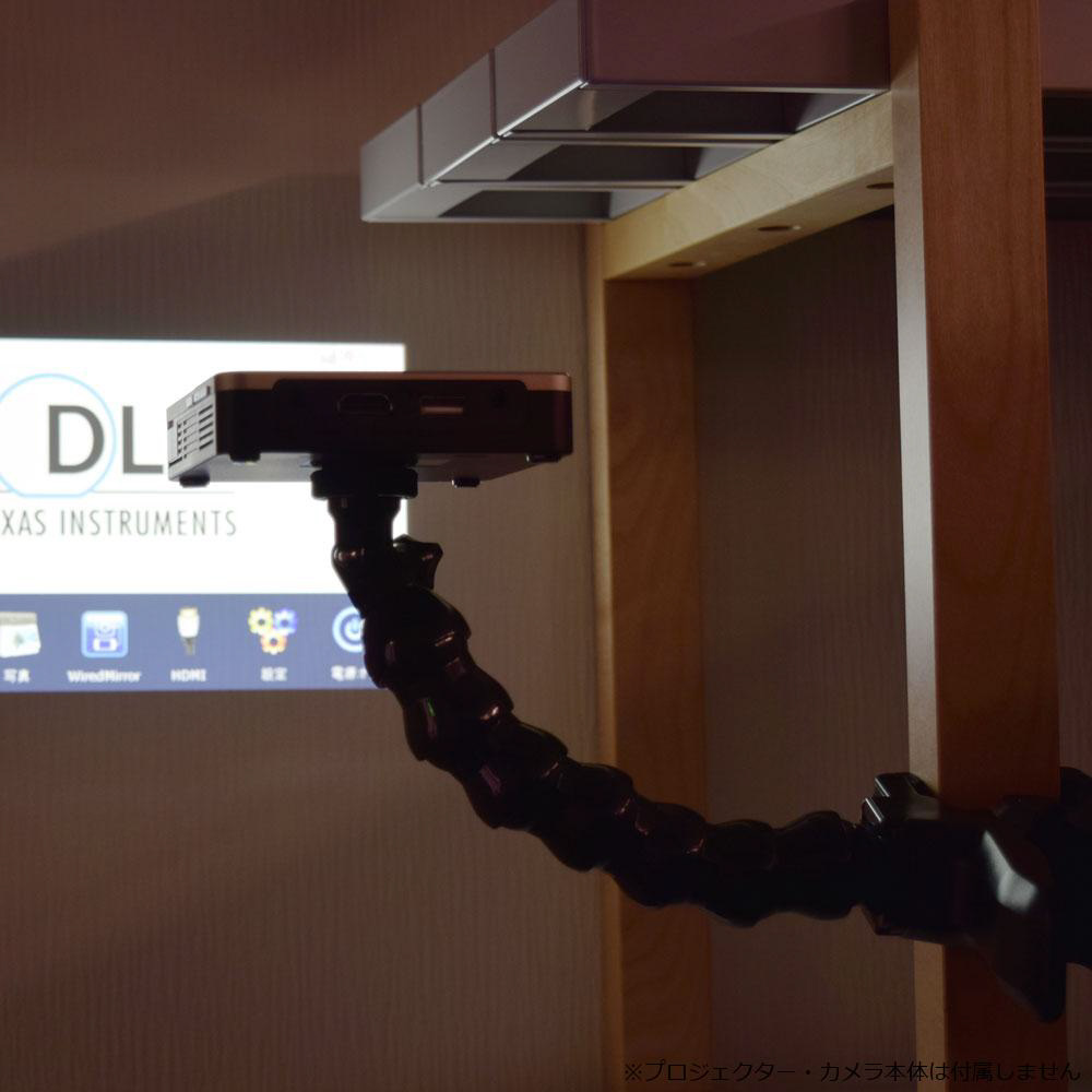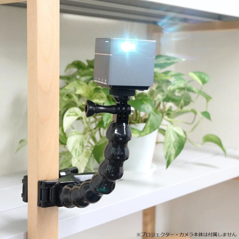 コンパクトサイズのモバイルプロジェクターを棚板やラックに取り付け!強力クリップマウントとフレキシブルなジョイントアームで、プロジェクターの設置方法を飛躍的に拡大できる、カメラ三脚ネジ(1/4-20 UNC)+GoProマウント対応マルチアングルマウント。
