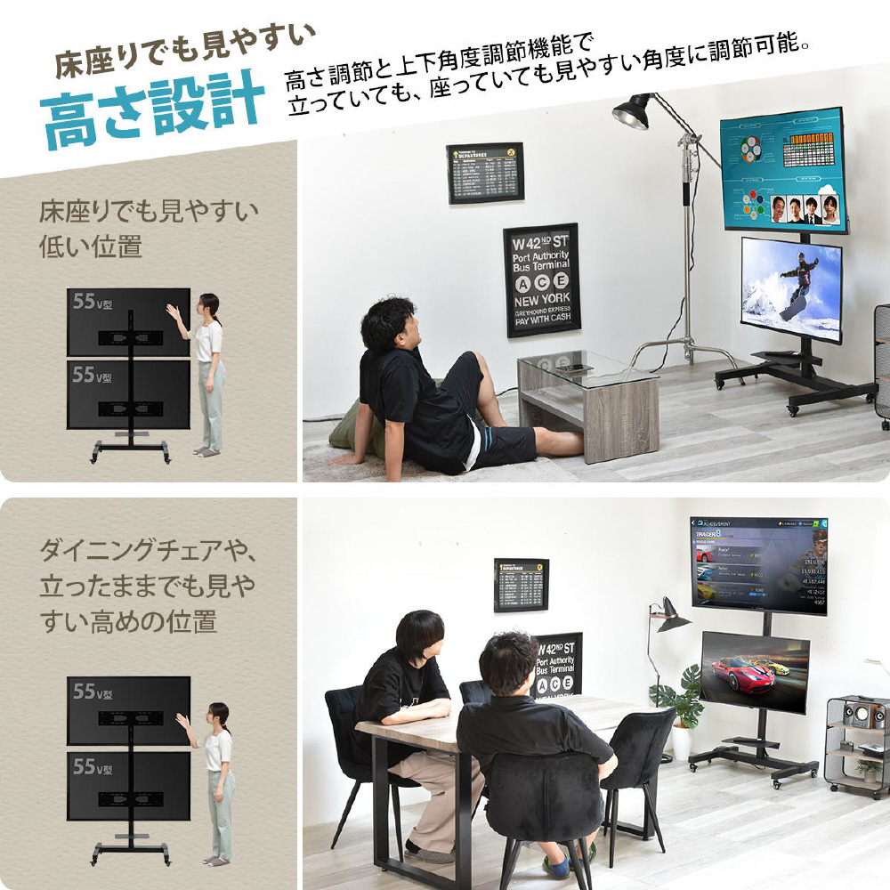 床座りでも見やすい低い位置、ダイニングや立ったままでも見やすい高めの位置に。