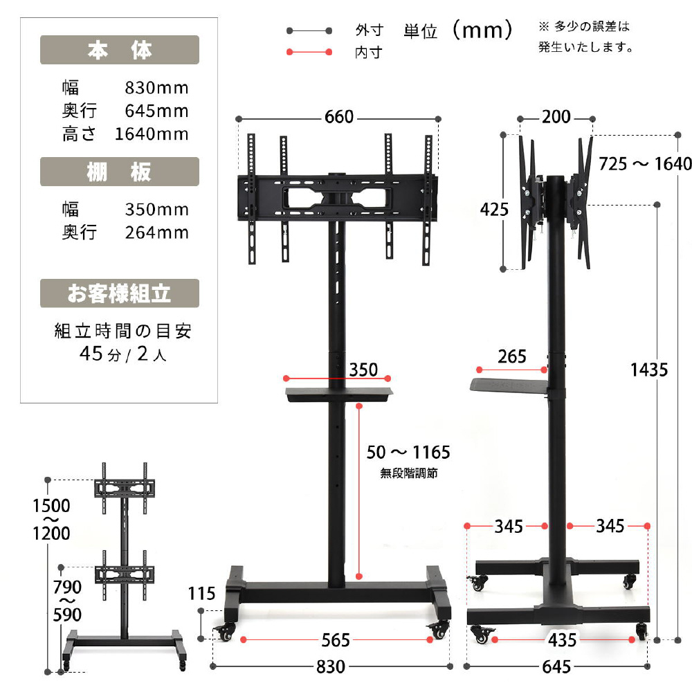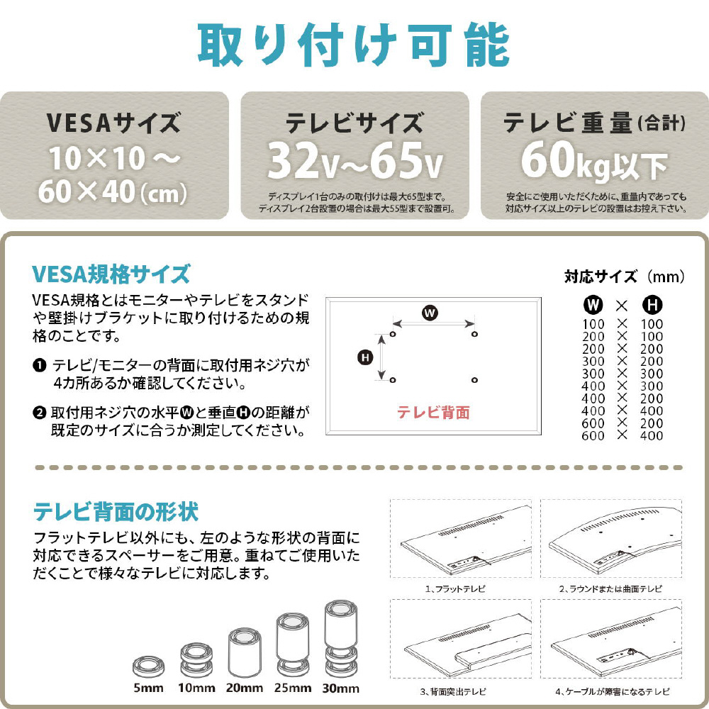 ■素材:スチール(エポキシ粉体塗装) 【対応テレビ:1台設置の場合】32-65型 【対応テレビ:2台設置の場合】32-55型 【対応VESA】100×100mm〜600×400mm