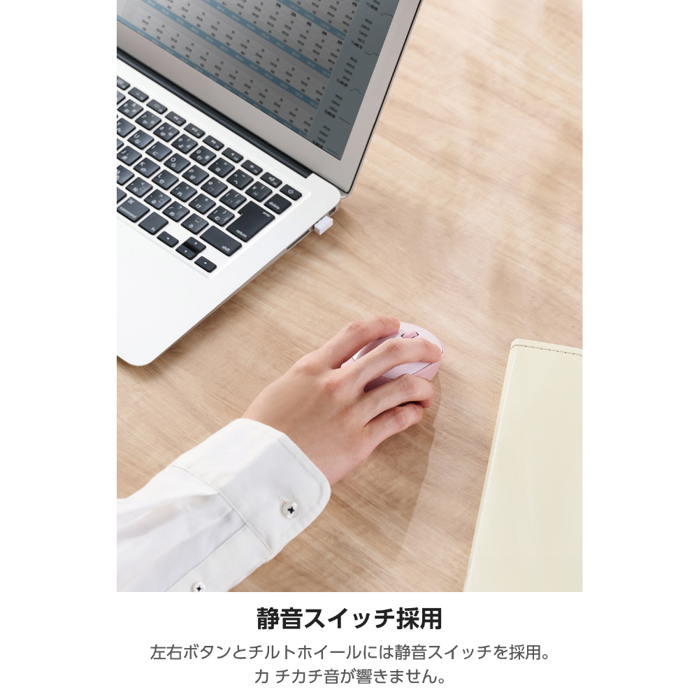 ■全てのボタンが静音対応。クリックしてもカチカチ音が響きません。ミーティング中やリビング・カフェ、シェアオフィスなど周りに人がいる場面でも音を気にせず使えます。
