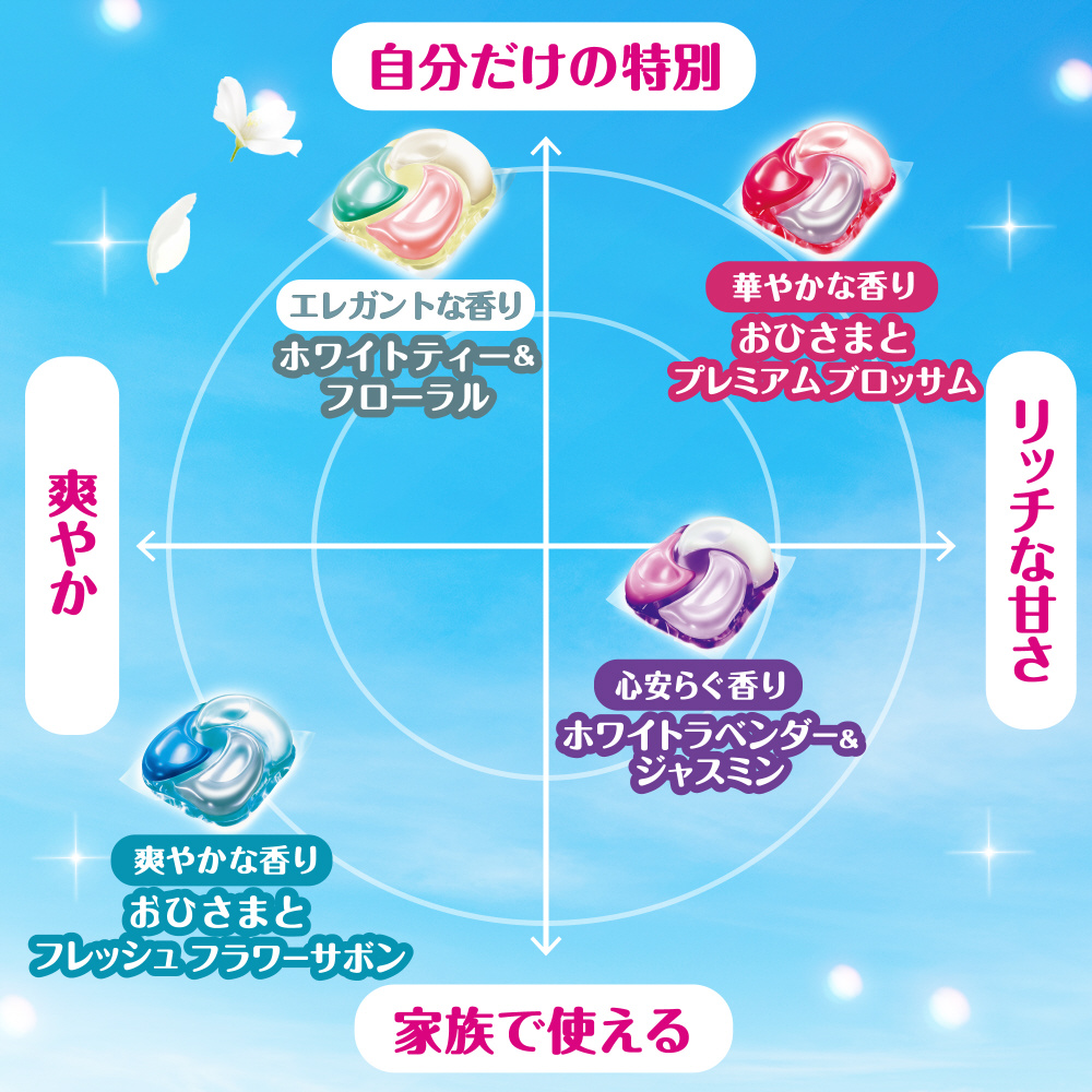 5つ星HOTEL発想 ホワイトティー&フローラルの香り柔軟剤効果 4 in 1強洗浄 洗い上がり輝く白さシワ *1 &黄ばみ防止 *1  アイロンがけが楽に! *1ふんわり仕上げ 驚きの柔らかさ香り長続き 着ている間も華やか消臭成分2倍濃縮 *2