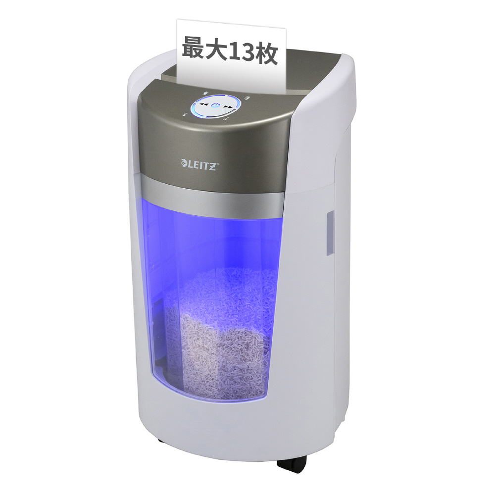 自動くずならし機能搭載のNEWスタイルシュレッダ。ダストボックスが回転することで、収容できる用紙の枚数がUP。細断時にダストボックスがライトアップするユニークな機能。