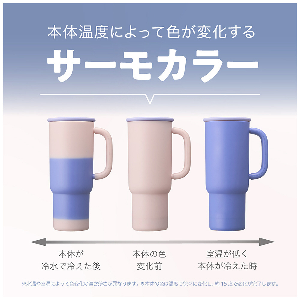冷水を入れて本体が冷えると本体の水が入っている部分の色が変化します。また、室温が低く本体が冷えたとき、本体全体の色が変化します。これは、お子さま向け浴室用玩具で用いられる「温度で色が変わる技術」を応用したものです。本体はピンク → ブルーへと変化します。
