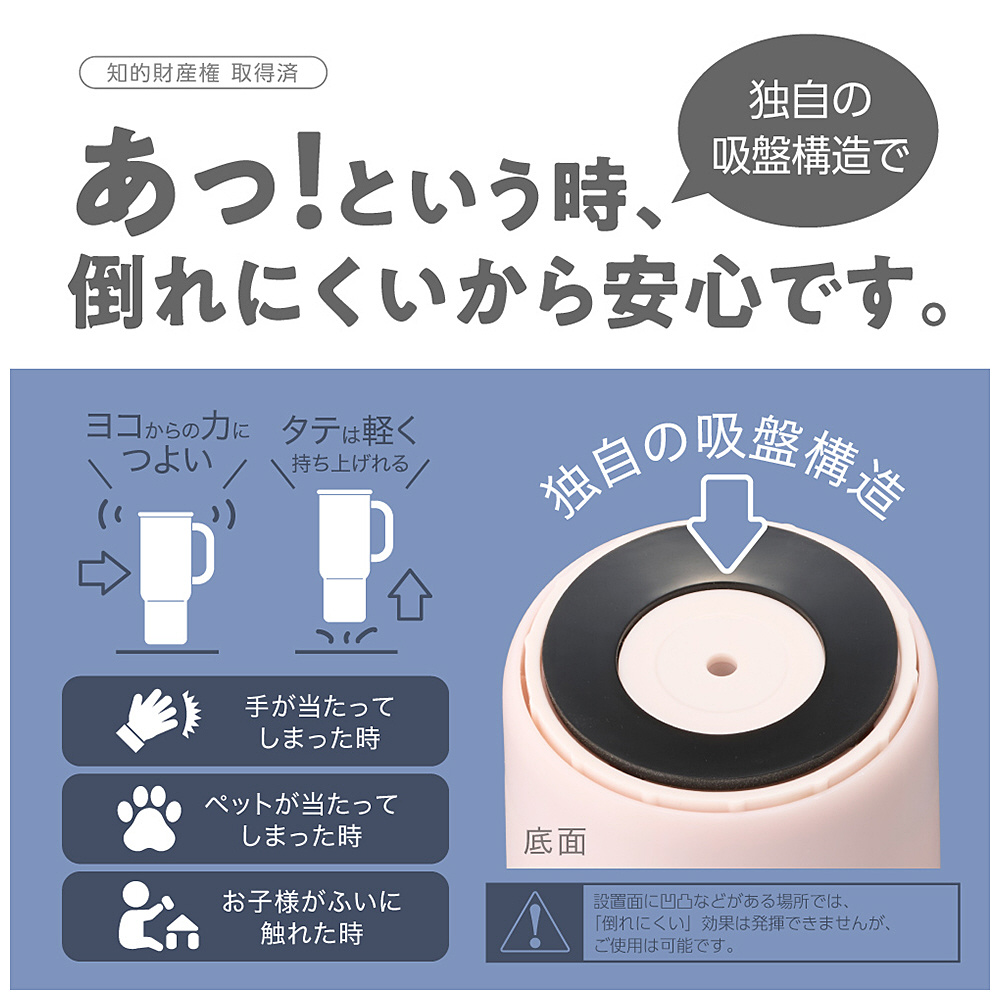本体底面に吸盤があり、接地面に吸着することで横からの衝撃に強く、倒れにくい構造です。デスクで手が当たったときやお子さまが触れてしまったときなど、あっ!という時に倒れにくいため安心です。一方で、真上に持ち上げると簡単に持ち上げる事ができます。
