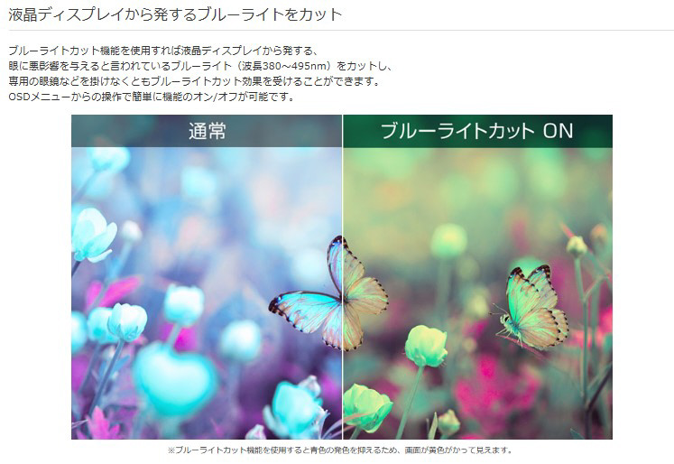 ※ブルーライトカット機能を使用すると青色の発色を抑えるため、画面が黄色がかって見えます。