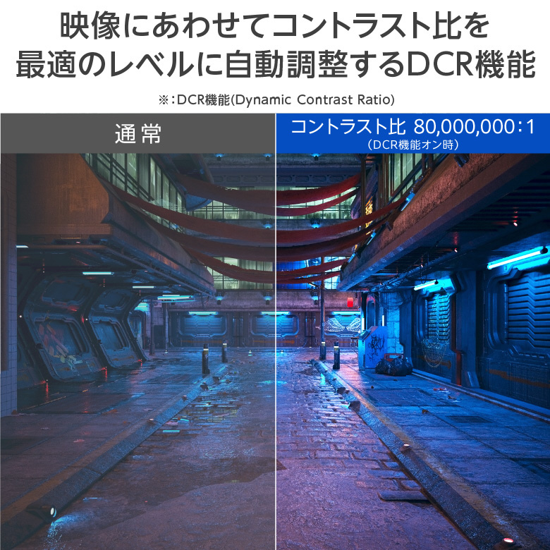 コントラスト比1000:1(DCR機能※on時80,000,000:1)の高コントラスト液晶パネルを採用しているので、高品質で美しい画像の表示ができます。