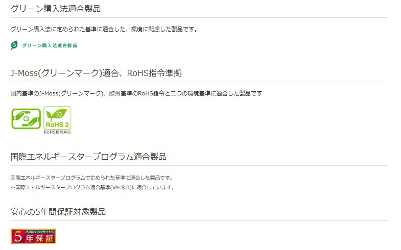エッジライト式の白色LEDバックライトを採用し、動作時の消費電力は最大27W、パワーマネージメント機能での節電時は0.5W以下に抑え、省エネルギーに貢献します。