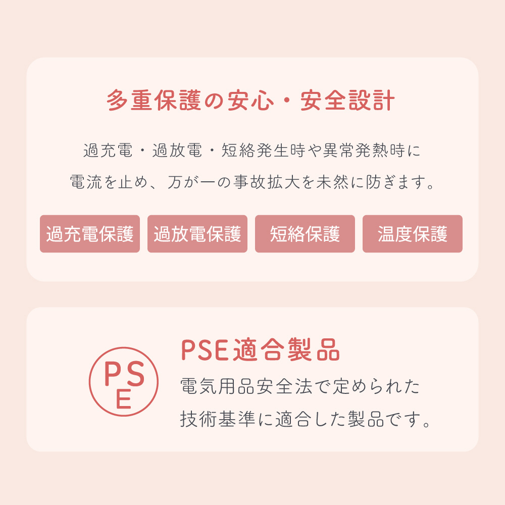 日本の法律である「電気用品安全法」で定められた検査を実施したPSE適合製品です。安心■安全にご利用いただけます。