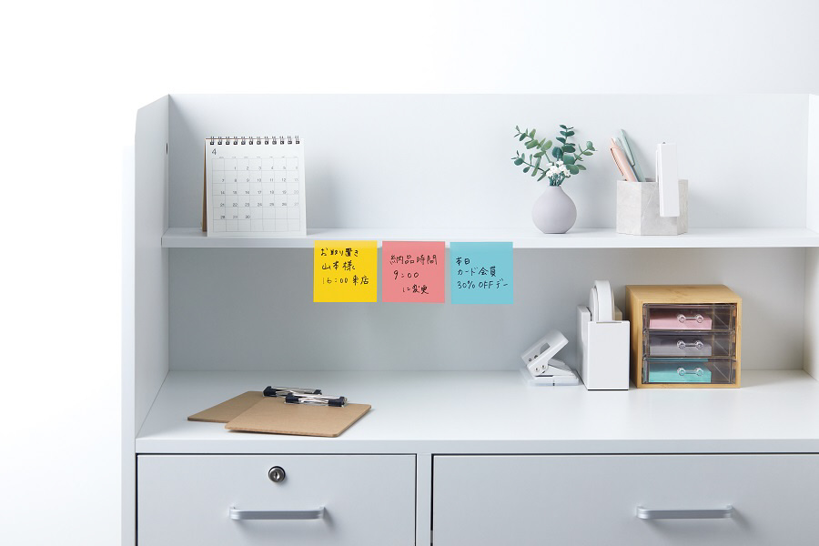 ●約2倍の粘着力(3M通常粘着比)で、パソコンや電話、キャビネットなどの樹脂面や垂直面など、つきにくかった場所にもしっかり貼れてはがれにくい製品です。