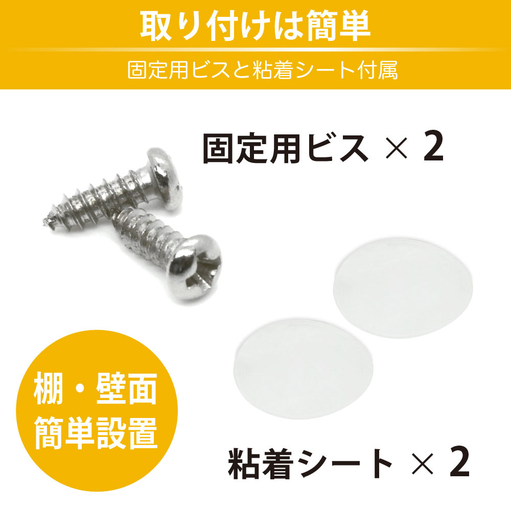付属の固定用ビスと粘着シート、2種類の固定方法に対応。