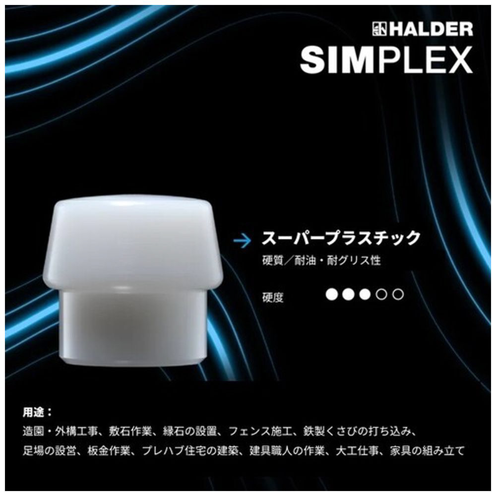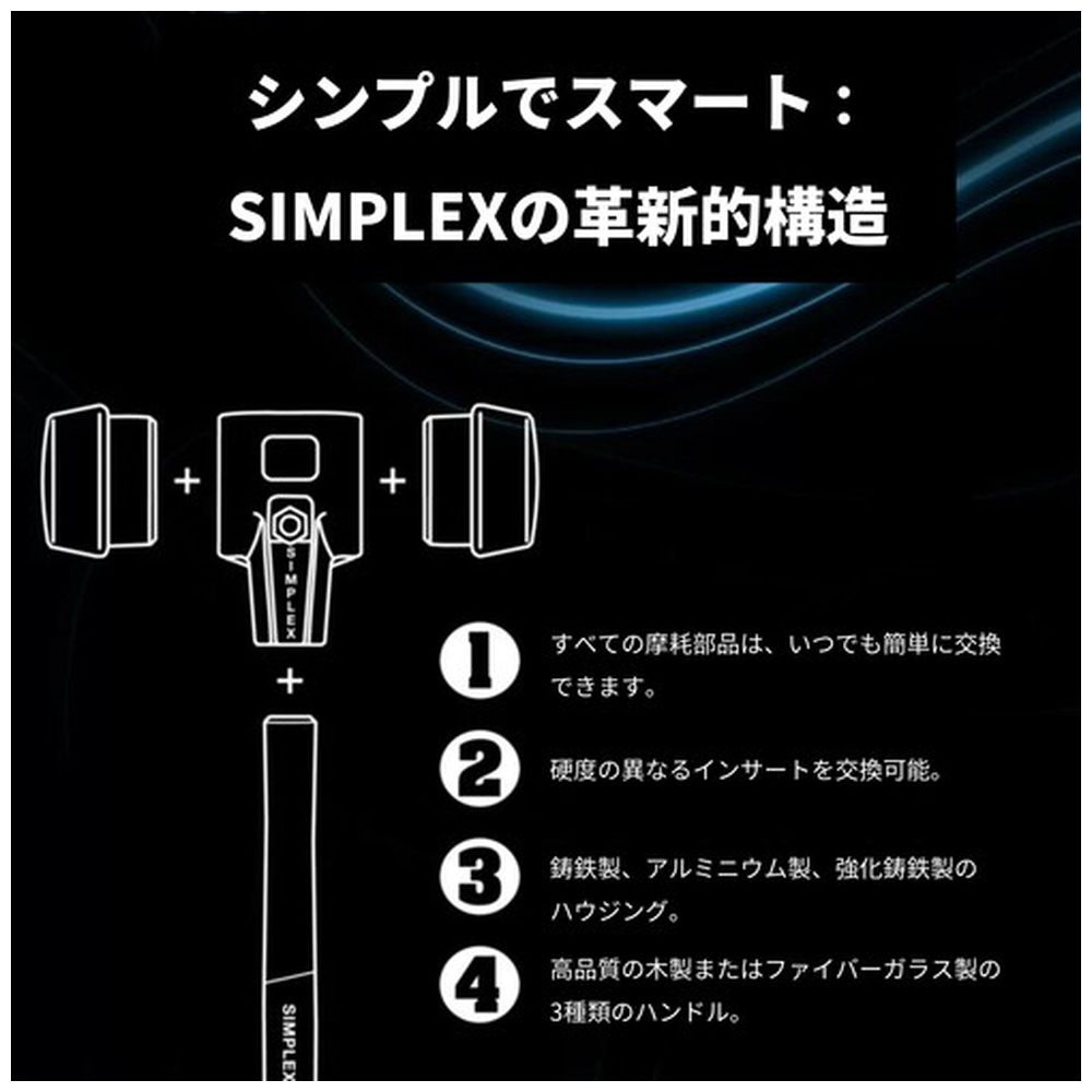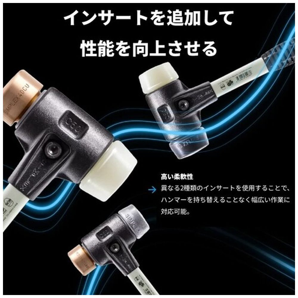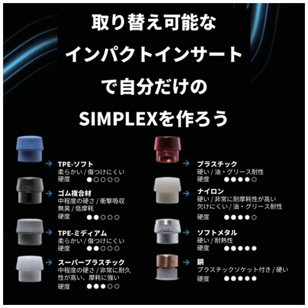 ■SIMPLEXハンマーは、スーパープラスチック製インサート(白色、中程度の硬さ、耐久性あり)とナイロン製インサート(白色、硬く、耐摩耗性・耐油性に優れ、低温でも欠けにくい)を備えています。