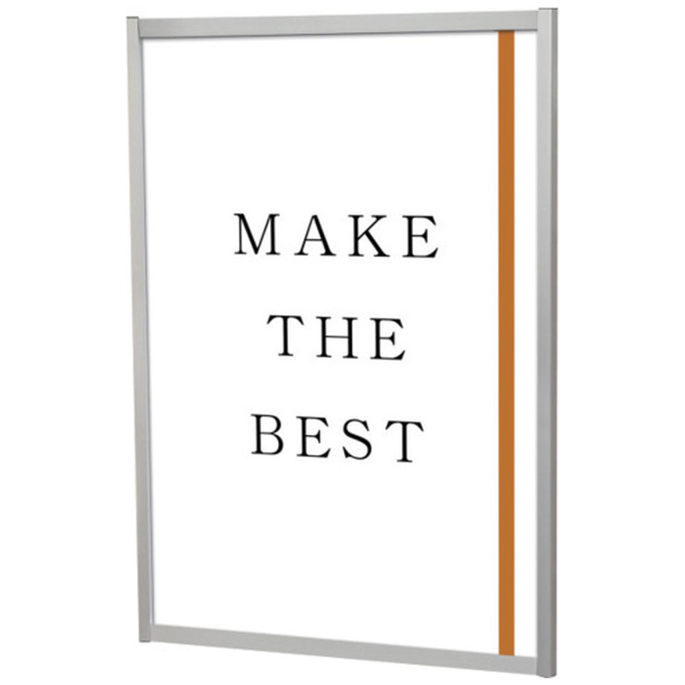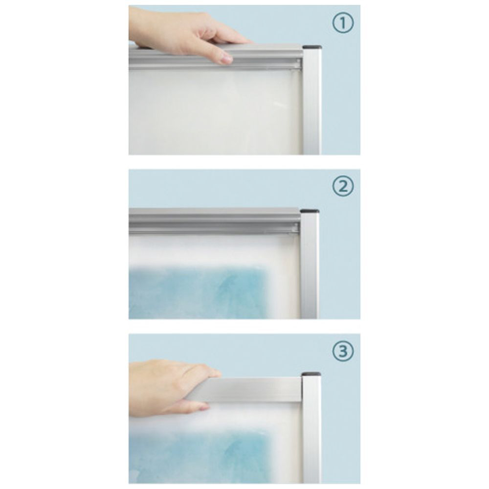 ■【ポスターの交換方法】上下2辺のフレームを開き、ポスターとアクリルカバーを片側に差し込むようにセットし、上下2辺のフレームを閉めアクリルカバーを固定します。