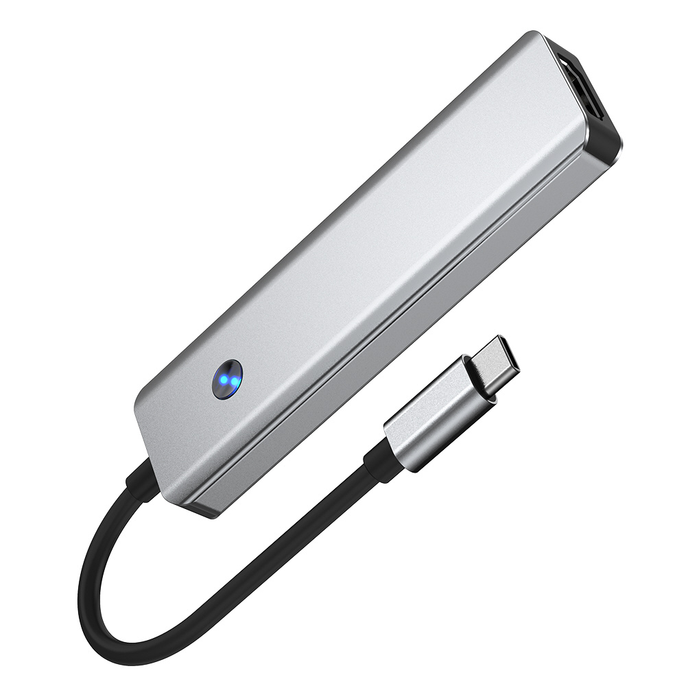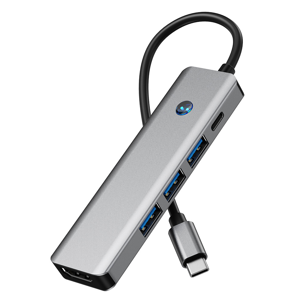 外部ディスプレイの映像を瞬時にオン/オフを切り替えられるスイッチ搭載。HDMI・USB Type-C・USB Type-Aポートなどの5ポートを1台にまとめた5in1タイプのアルミ製のドッキングステーションです。