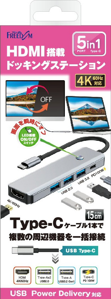 映像出力ON/OFFスイッチ付 USB Type-Cドッキングステーション 5in1 HDMI(4K/60Hz)/PD100W入力/Type-Ax3/5Gbps対応 ケーブル長15cm グレー メタリックグレー FUDH-UCH051G [USB Power Delivery対応]