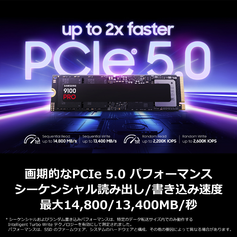 PCIe 5.0のパフォーマンスを最大限に引き出します。 9100 PROは、990 PROの 2 倍である最大14800/13400 MB/秒の超高速シーケンシャル読み出し/書き込み速度を実現します。