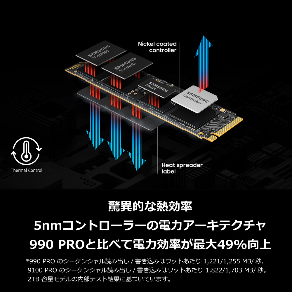 高度な 5nmコントローラーの電力アーキテクチャにより、990 PROと比べて電力効率が最大49%向上します。