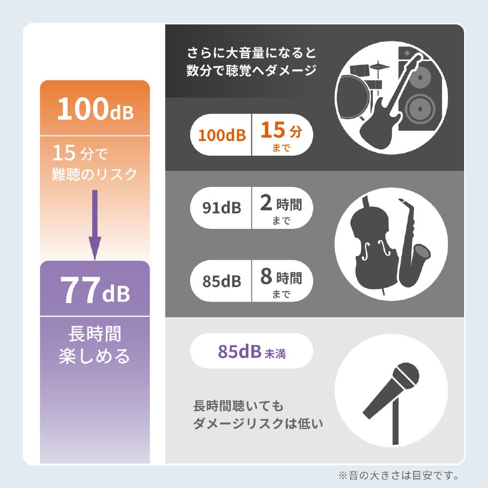 サウンドバランスを損なわず、自然な聞こえのまま音量を抑えられるため、過度な不快感や閉塞感を最小限に抑えて快適に過ごすことができます。