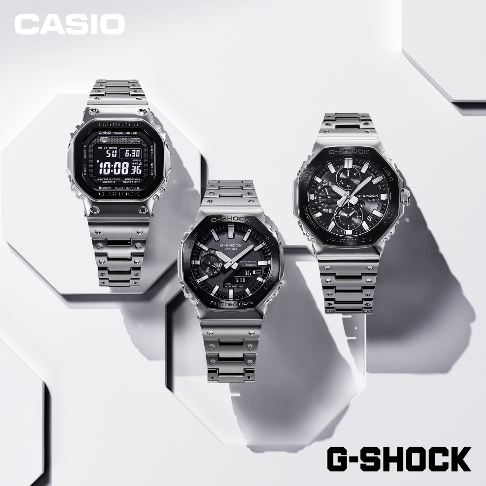 シルバーの中に際立つブラックがG-SHOCKの象徴的な強さを強調しつつ、幅広いスタイルに合わせやすいモノトーンデザインとなっています。