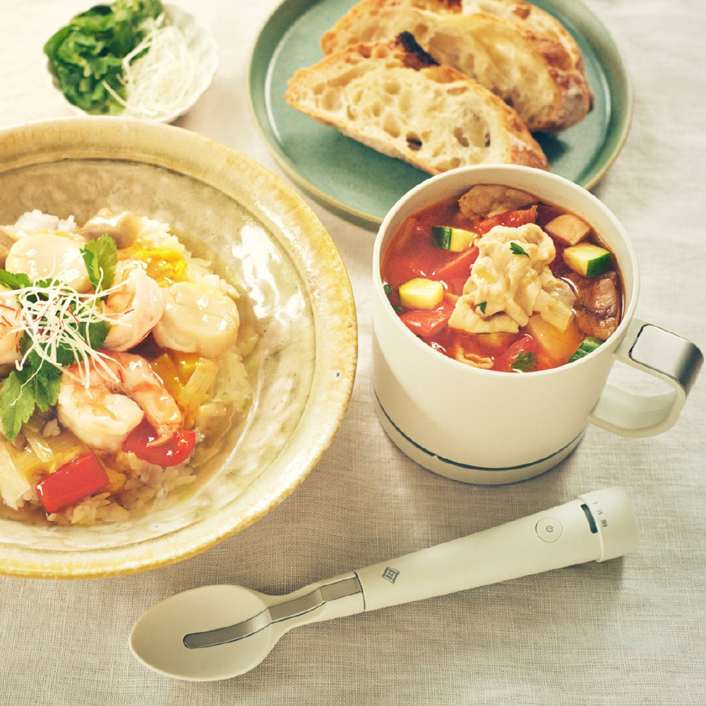 微弱な電気のチカラによって、食事の塩味やうま味を引き出してくれる減塩サポート食器※。※体感には個人差があります。また、料理によっても感じ方が異なる場合があります。いつものお箸やレンゲをエレキソルト スプーンに替えるだけで塩分を控えたスープやカレーがおいしく楽しめます。