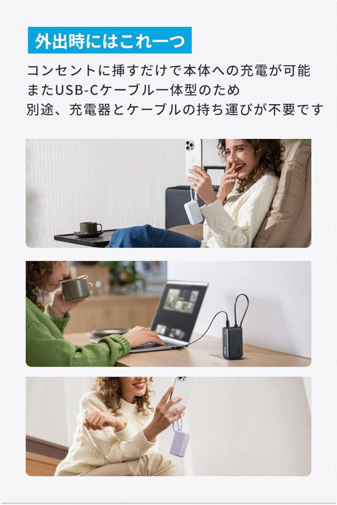 折りたたみ式プラグを採用し、ポーチやミニバッグにも収まる小型デザイン。コンセント一体型且つUSB-Cケーブル一体型のため、充電器とケーブルを別途持ち運ぶ必要がありません。