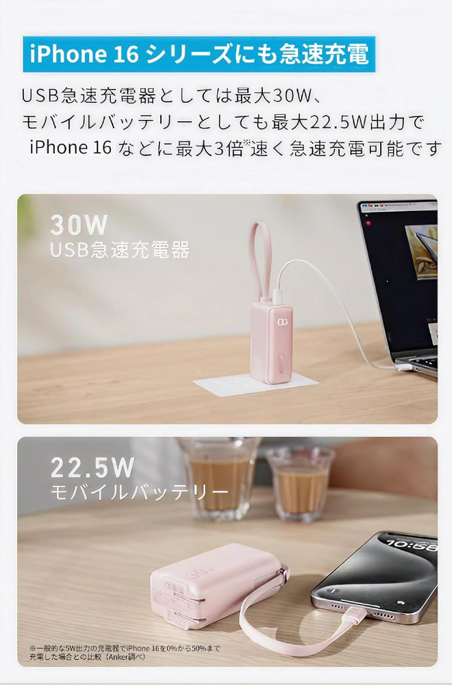 ※一般的な5W出力の充電器でiPhone 15を0%から30%まで充電した場合との比較(Anker調べ)