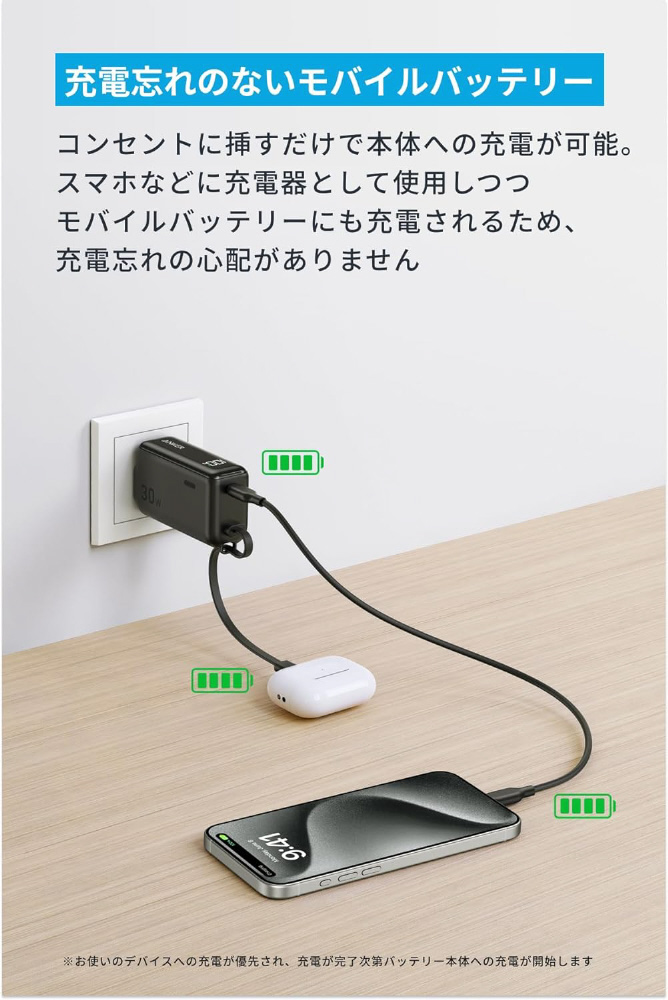 モバイルバッテリー Power Bank (30W Fusion Built-In USB-C ケーブル) ブラック A1636N13 [USB Power Delivery対応 /2ポート]