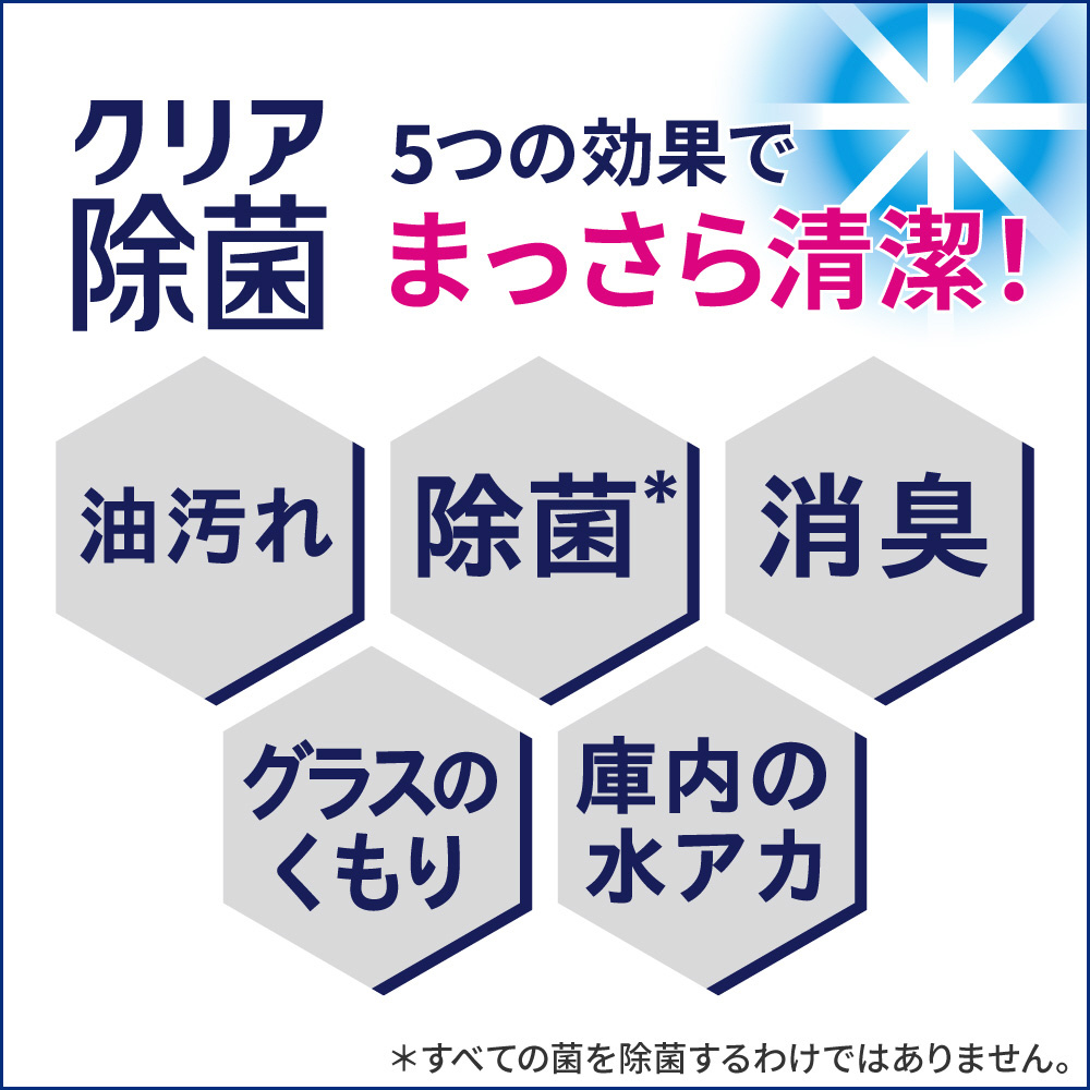 食器も庫内もまるごと一発洗浄!しつこい油汚れ・ニオイ・菌のエサまで落とし、つめこみ洗いでもすみずみ清潔。ご飯粒・卵などの落としにくい汚れ、グラスのくもり、庫内の水アカも落とします。まとめ洗いでも、食器が重なっていても、フライパンや鍋も、しっかり洗浄。除菌※・消臭も。ワンプッシュで1回分が出るボトルだから、片手でラクラク計量いらず。香りが気にならない無香性。※すべての菌を除菌するわけではありません。