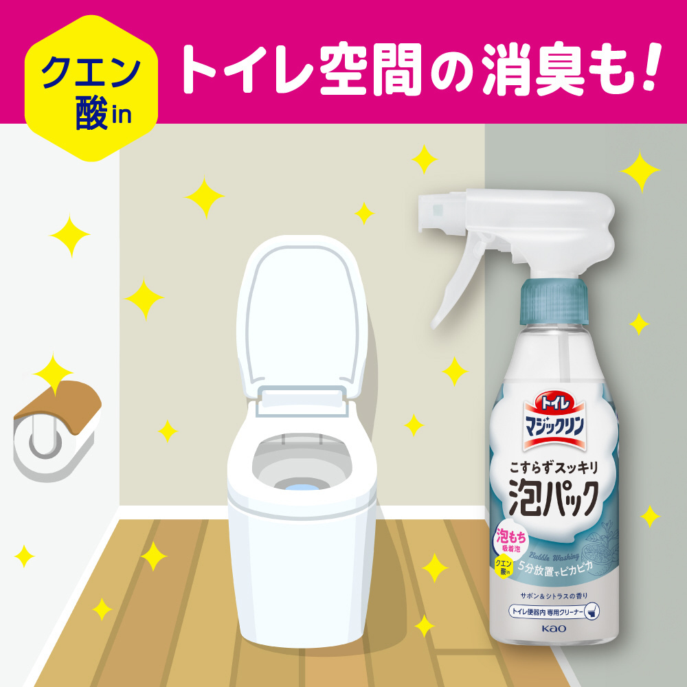 泡もちバツグン※1吸着泡で便器をぐるっとおおうだけ。ほったらかして(5分以上放置)トイレピカピカ!※2 ゴシゴシいらず※2でラクラクきれい!消臭もできるクエン酸in処方のトイレ便器内専用クリーナー!逆さスプレーできるから、フチ裏もしっかりパック。清潔感のあるサボン&シトラスの香り ※1当社品比※2便器内専用、こびりついた汚れは落とせません。