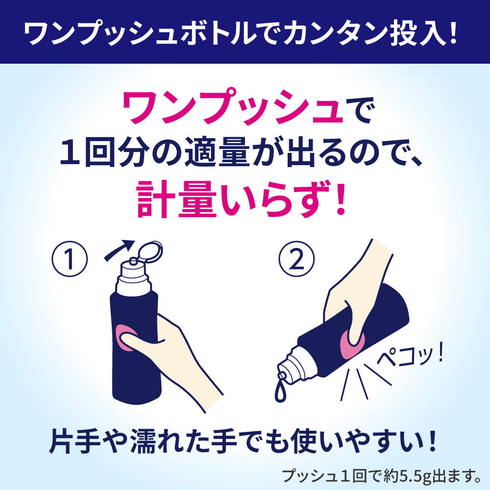食器も庫内もまるごと一発洗浄!しつこい油汚れ・ニオイ・菌のエサまで落とし、つめこみ洗いでもすみずみ清潔。ご飯粒・卵などの落としにくい汚れ、グラスのくもり、庫内の水アカも落とします。まとめ洗いでも、食器が重なっていても、フライパンや鍋も、しっかり洗浄。除菌※・消臭も。ワンプッシュで1回分が出るボトルだから、片手でラクラク計量いらず。香りが気にならない無香性。※すべての菌を除菌するわけではありません。
