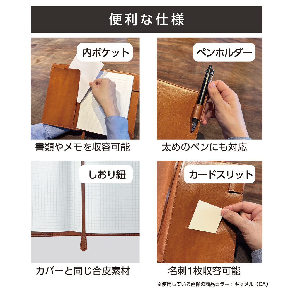 ●書類やメモを収容できる内ポケット付/太めのペンにも対応したペンホルダー付/カバーと同じ合皮素材のしおり紐付/名刺やカードを1枚収容できるカードスリット付