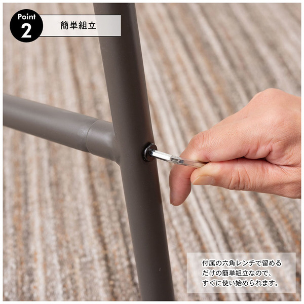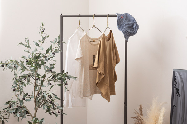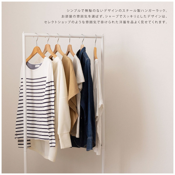 お部屋の雰囲気を選ばず、シャープでスッキリとしたデザイン。セレクトショップのような雰囲気でお気に入りの服を魅せながら収納。軽量設計なので持ち運びもらくらく。付属の六角レンチでボルト留めするだけの簡単組立式。ハンガー上部にはストッパーが付いているので、衣類のずり落ちを防止。脚キャップが付いているので床への傷付きを防止。