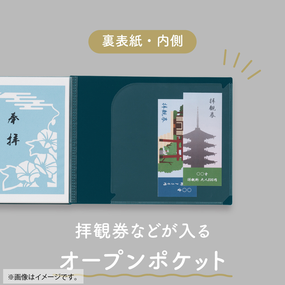 うら表紙の内側には、便利なオープンポケットが付いているので、参拝した際の拝観券やパンフレットも一緒に収納することができます。