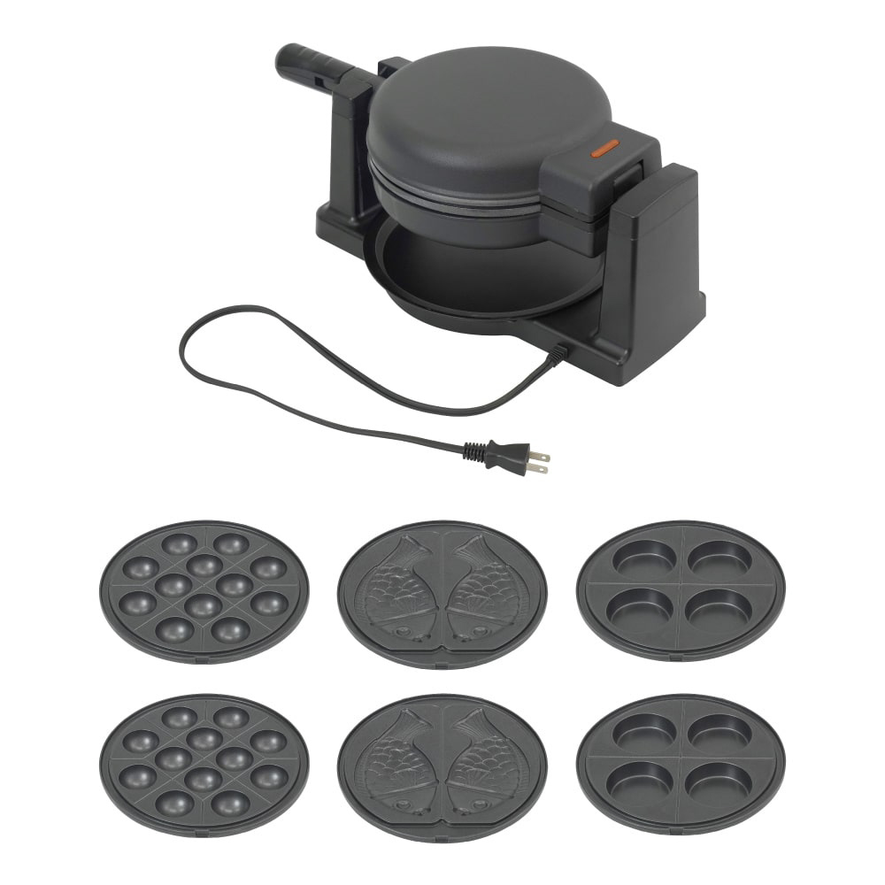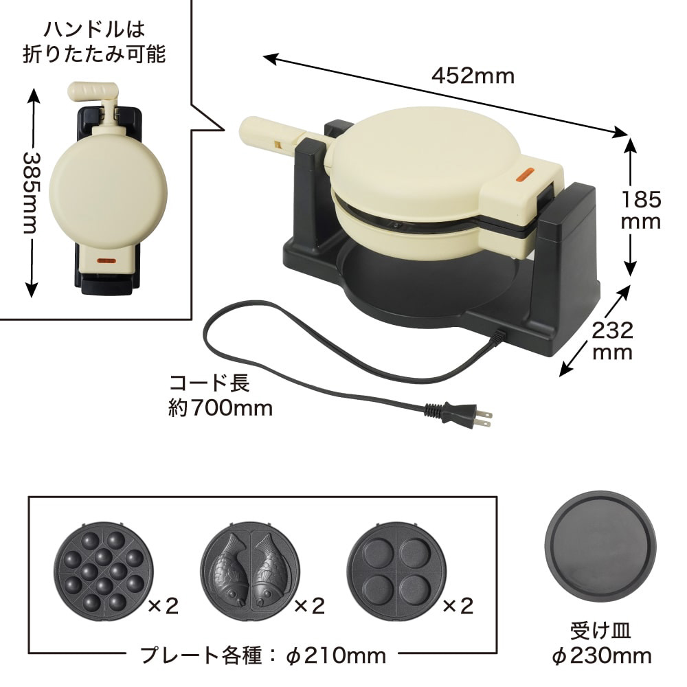 仕様2 セット内容:本体、プレート3種(タコ焼き・タイ焼き・大判焼き)×2、受け皿、日本語取扱説明書 重量:タコ焼きプレート(2枚):約350g タイ焼きプレート(2枚):約300g 大判焼きプレート(2枚):約360g