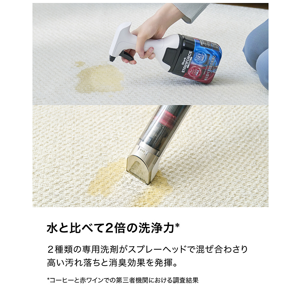 ■2種類の専用洗剤がスプレーヘッドで混ぜ合わさることにより、高い汚れ落ちと消臭効果を発揮。水と比べて2倍の洗浄力で、驚くほどキレイに