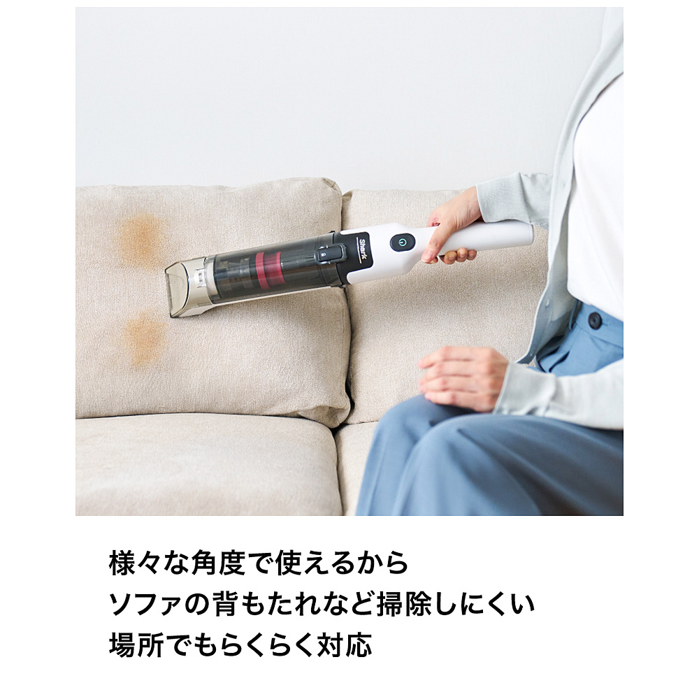 ■様々な角度で使えるから、ソファーや車のシートの背もたれなど、普段掃除しにくい場所にも対応。場所によってアタッチメントを付け替える煩わしさもありません