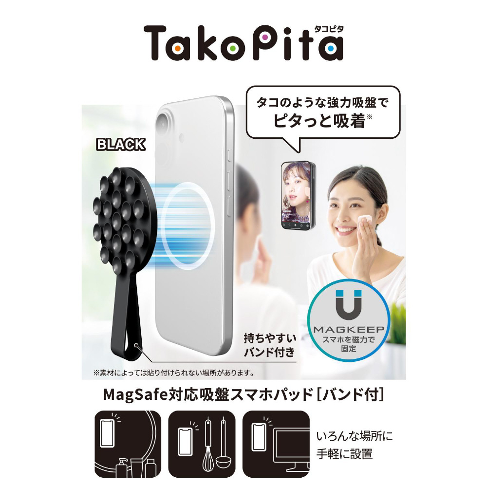 日常の“ながらスマホ”をより便利に!壁や鏡、窓ガラスなどの平らな面に、タコの吸盤のようにピタッと吸着する“TakoPita”スマホパッドです。強力な磁力でMagSafe対応スマホケースやiPhoneをしっかり固定し、両手を使わずにスマートフォンの操作や動画視聴が可能。落下防止に役立つバンド付きです。