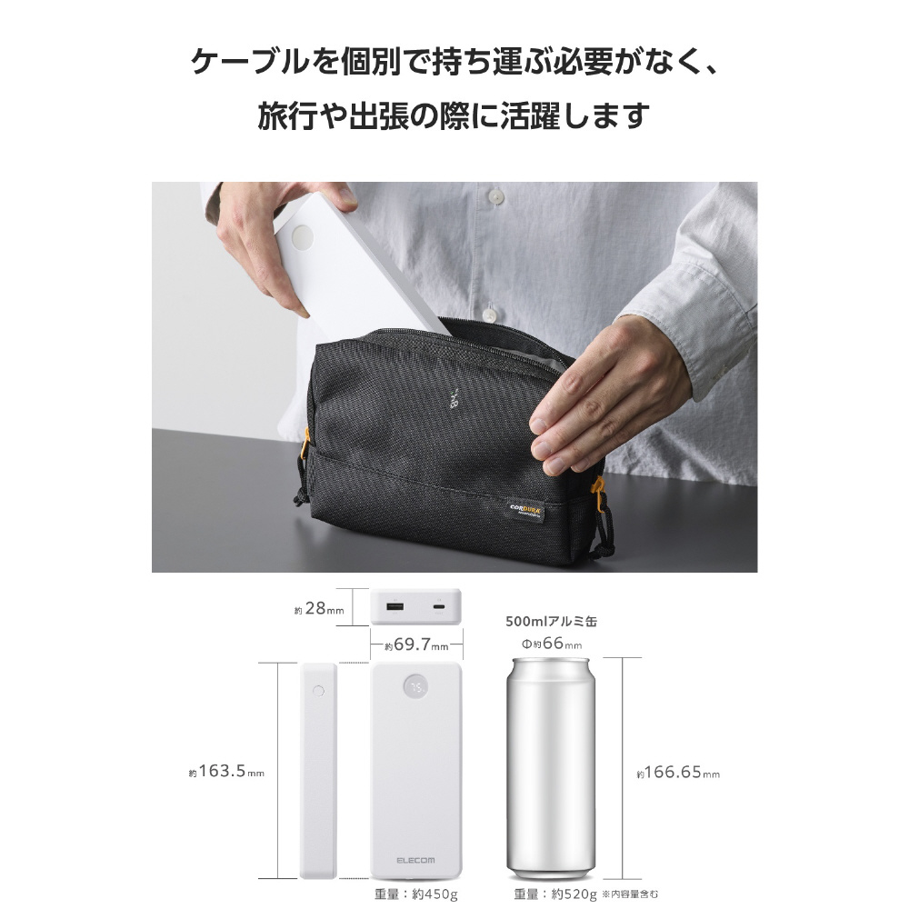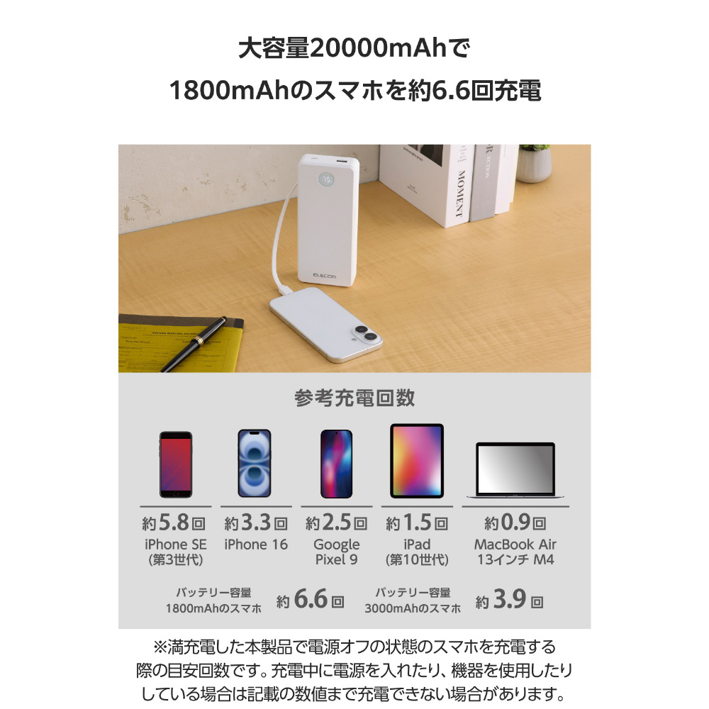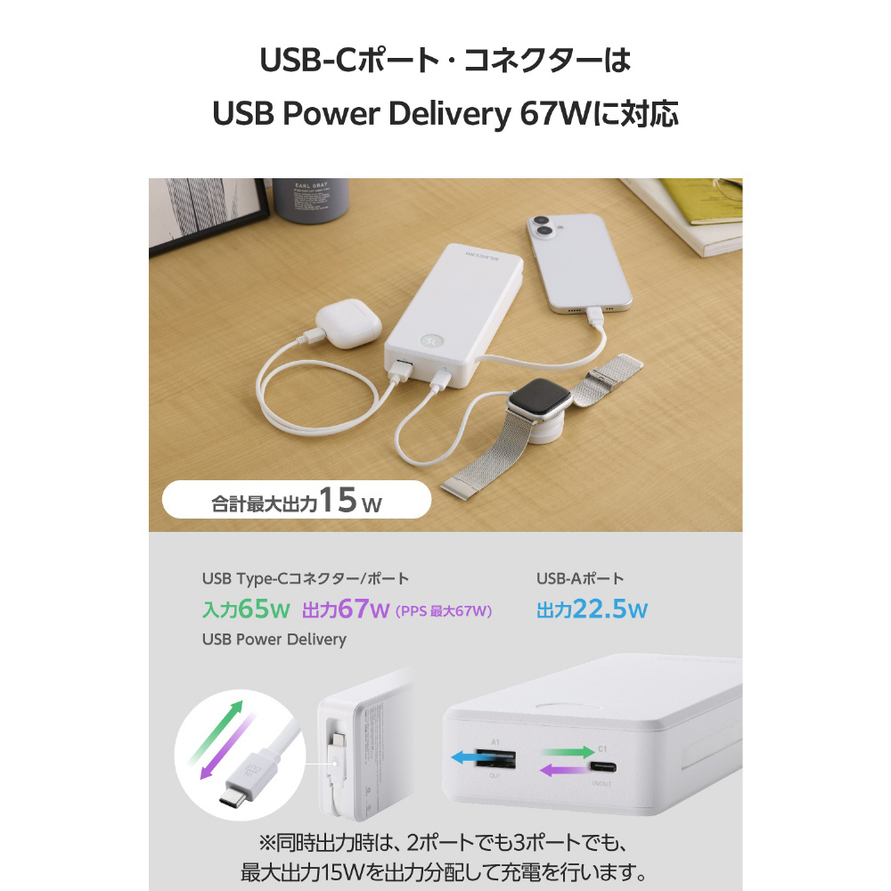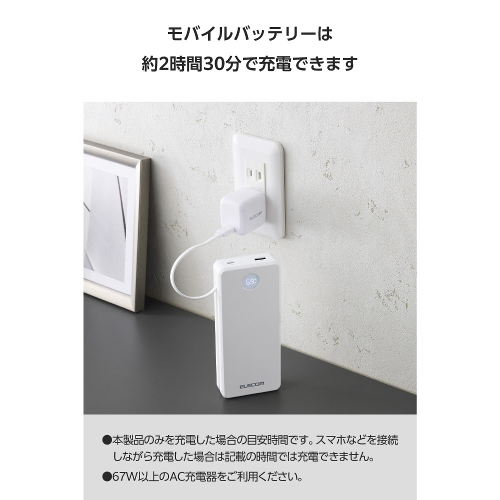 モバイルバッテリー 20000mAh 67W充電 ケーブル一体型 ノートPC対応 大容量 残量表示 PSE適合 旅行/出張/防災 ホワイト DE-C77-20000WH